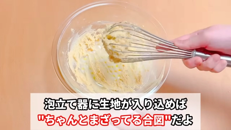 いくら混ぜても生地が分離してしまう場合は、ホットケーキミックスを少量加えるとまとまります。泡立て器に生地が入り込むようになれば、しっかり混ざっているサインです。