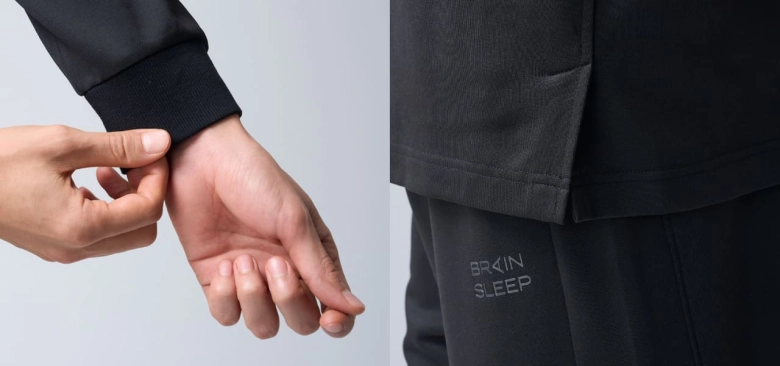 デザインは「ブレインスリープ ウェア リカバリー」と似ていて、アームホールを大きめにしたり、ゴムやリブなどの締めつけを可能な限り減らし、寝ていても窮屈さを感じず動きやすさをしっかり考慮。トップスはフィンガーホール付きで寒いときには手まで覆うことができたり、暑いときはパンツに施された足首のストッパーで丈を調節することができますよ。