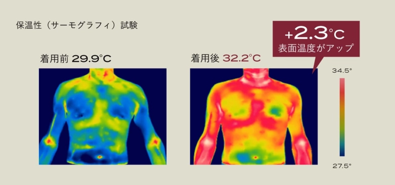 秘密は繊維にあります。天然鉱物を原料とするセラミックス、純度の高い厳選したセラミックスを独自ブレンドし、ナノレベルでの高濃度処方で繊維に練り込んであるんです。また、特殊な糸形状にすることで、体温の吸収と遠赤外線放射を高め、表面温度が約+2.3度アップすることがサーモグラフィで明らかに!