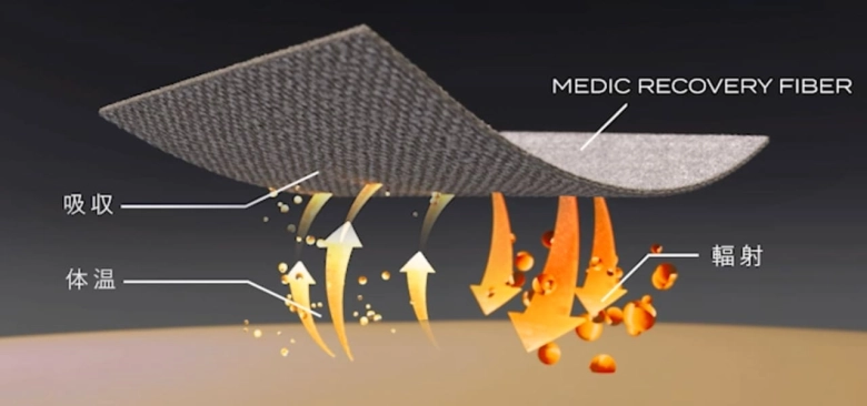 独自開発されたリカバリー素材「MEDIC RECOVERY FIBER(メディック リカバリー ファイバー)」を使ったこのウェアは、一般医療機器にも認定されています。これをパジャマにして寝るだけで、疲労回復、血行促進、筋肉のハリコリの軽減、筋肉の疲れ緩和と、4つの効能効果が期待できるんだそう。生地に練り込まれた成分が、高レベルの遠赤外線放射機能を発揮し体を温めてくれるという、まさにテクノロジーを駆使して生まれたアイテムです。