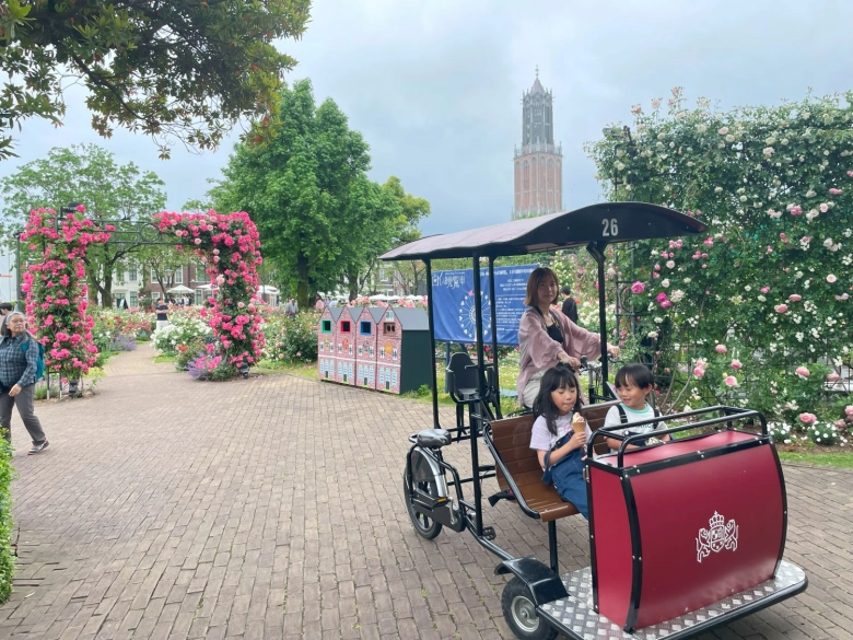 最初におすすめしたいのがレンタサイクルでのパーク内周遊。電動アシスト付き4人乗りをレンタルしたのですが、子どもたちはレンタサイクルのスリルに大興奮!ヨーロッパ風の街並みや花々を楽しみながら広大なパーク内をぐるっと一周しました。