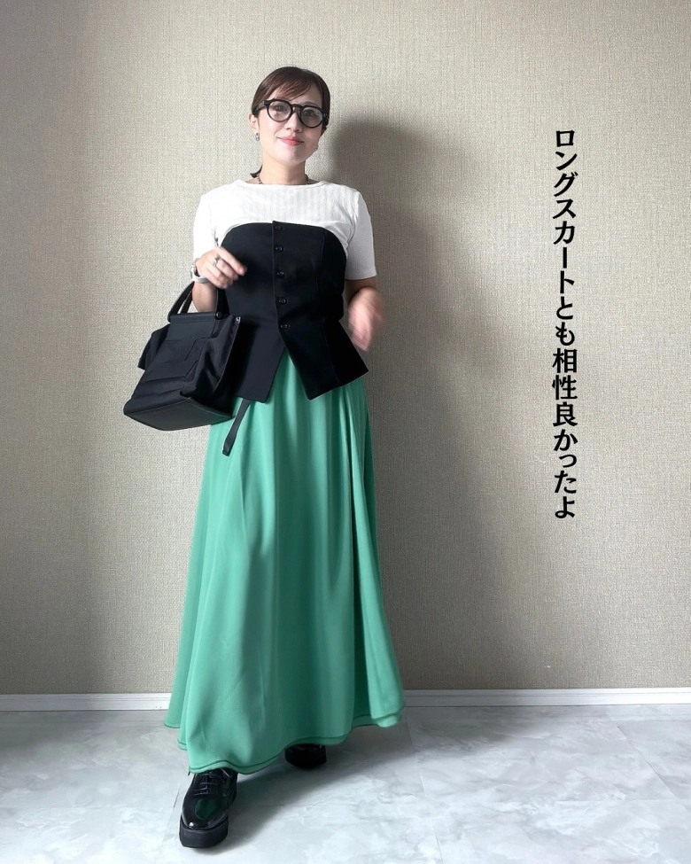 フロントボタンビスチェの肩ストラップは、長さ調整できるだけなく取り外しも可能!ストラップの有無よって異なる雰囲気を楽しめます。@happy20041002さんは、目を引くグリーンのスカートを主役にしたコーデに、ブラックのフロントボタンビスチェをプラス。締め色であるブラックを中心に配置したことで、コーデにメリハリが生まれています。