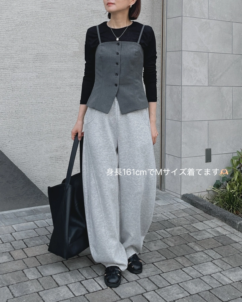 @karan_tknさんはグレーのフロントボタンビスチェをチョイスし、黒の長袖シアーTにオン!スウェットパンツにカットソーというリラックス感のある組み合わせに、フロントボタンビスチェをレイヤードすることで上品さをプラスしています。統一感のあるグレーカラーのコーディネートが秋先にぴったりですね。