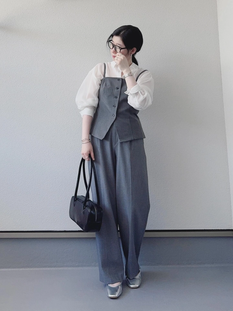 @haru1997kさんは、シアーな白いトップスにビスチェを重ねてきれいめコーディネートに。夏に活躍した透け感のあるアイテムも、ビスチェをレイヤードすれば秋でも違和感なく取り入れられます。ビスチェとパンツの色を合わせることでセットアップ風にしているのも、真似したいコーデ術です。