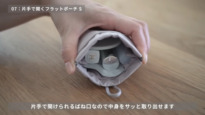 リップクリームや目薬など、カバンの中で散らかりがちなものをまとめたいときに重宝するのが、こちらのフラットポーチ。