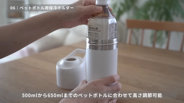 高さを調節できる仕様になっており、500mlから650mlまでのペットボトルに対応しています。保冷効果も抜群で、出先でも冷たいまま飲めるのはうれしいですよね。持ち運びに便利な取っ手がついているのも魅力♪