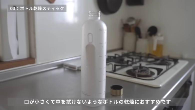 洗った後の水筒やボトルに入れることで、乾燥までの時間を短縮できます。逆さにして乾かすと約7時間かかるのに対し、なんとスティックを入れると約3時間にまで時短可能です。