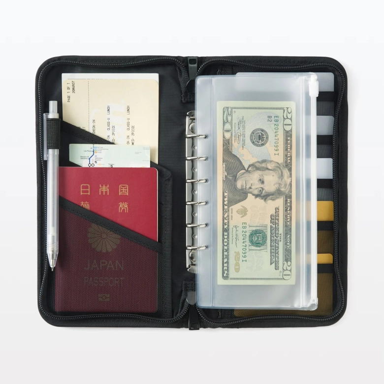 6穴リング式で収納ポケットが充実している、無印良品で人気のパスポートケース。旅先の通貨やチケット類、メモやペンもすっきり収納できます。口コミでは「パスポートやカード、お金などの貴重品をまとめて管理できて便利」「デザインがシンプルで使う人を選ばない」と管理のしやすさやシンプルなデザインが高評価。チケットやカードをたくさん収納したい方は、ぜひ手に取ってみてください。