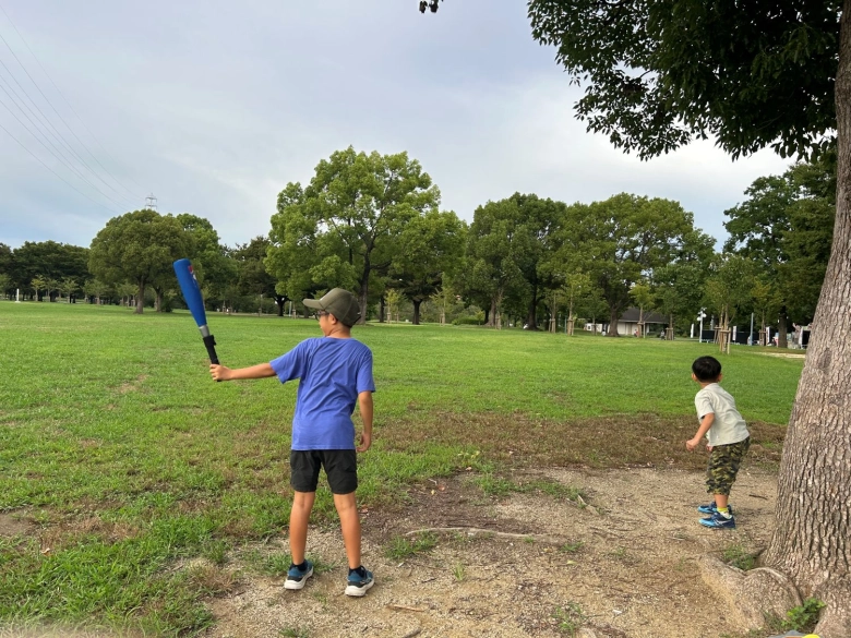お兄ちゃんが好きなものは、「ぼくも~!」と、次男も追いかけます。公園に出かけたら、一緒に野球。最初はバットにボールを当てることに苦労していましたが、最近はボール球もバンバン打っています(笑)。