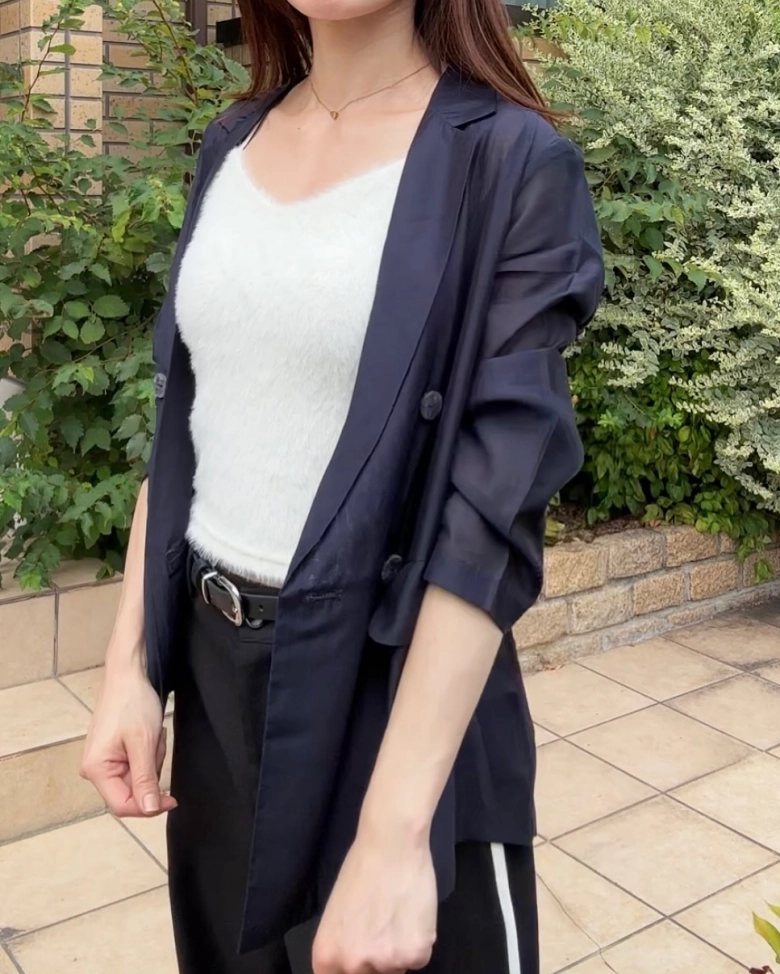 濃いめカラーを合わせるならシアー素材で軽さを出して