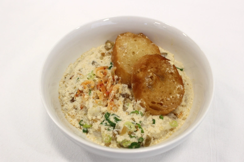 台湾の朝食メニューとして親しまれている「鹹豆漿(シェントウジャン)」を成城石井流にアレンジ。「鹹豆漿」の現地の人気店では、温かい豆乳を酢や調味料でおぼろ状に仕立てたやさしい味わいのスープに、油条(台湾の細長い揚げパン)を浸して食べるものだったそう。成城石井の料理人がそのおいしさに感銘を受け、お粥として登場したんですね。
