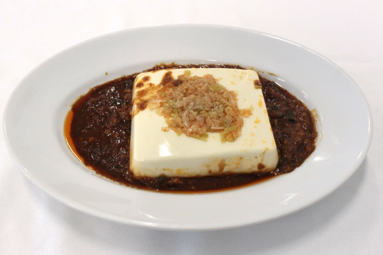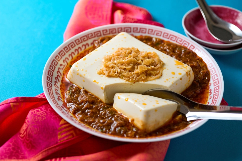 甜麺醤、麻辣醤、豆鼓醤、豆板醤の4つ醤を使用した成城石井の人気商品「四川山椒ピリ辛麻婆豆腐」の麻婆餡をベースに、豆腐は一度蒸して水分を抜くことで、程よい硬さにするとともに豆腐の旨みを凝縮させるひと手間も。花椒と五香粉で炒めた葱ラー油ソースをかければ台湾風の味わいが完成。辛さ強めの本格的な麻婆豆腐といった印象です。通常の麻婆豆腐とは違って豆腐全面に餡がついていないため、餡やソースを絡める量を調整して辛さを自分好みにできる点も、1丁まるごと使っている良さだなと感じました。絹ごしならではのツルンとした喉越しの麻婆豆腐は新鮮で、四川風とは違う味わいを楽しめますよ♪