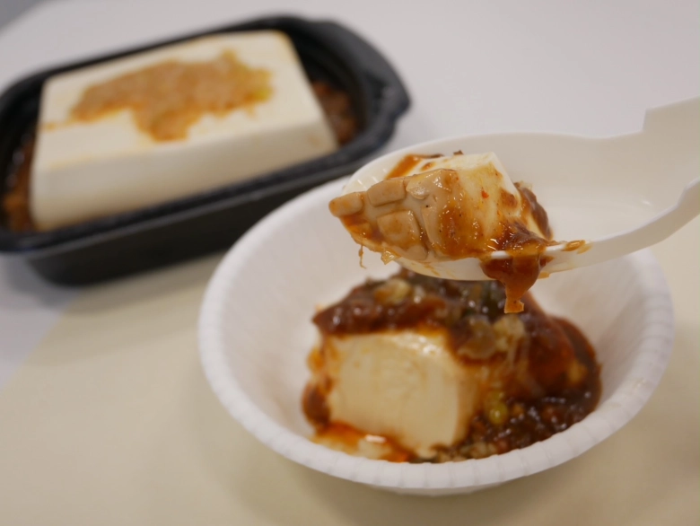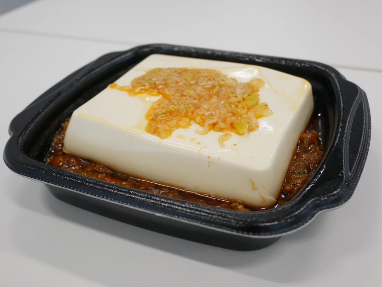 見た目に驚かされたのが絹ごし豆腐が1丁まるごとドーンと入った新感覚の一品です。台湾の麻婆豆腐はその多くが絹ごし豆腐を使用していることに気づきを得て開発された商品で、絹ごし豆腐を丸ごと1丁使用して崩しながら食べる新たなスタイルで商品化されました。