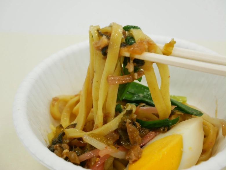現地の定番料理「意麺(イーメン・小麦粉と卵から作られた平打ちのちぢれ麺)」を成城石井らしくアレンジしています。麺は本場の味わいを再現するため、現地にならって小麦粉と卵を使用した平打ち麺をわざわざ開発したのだとか。