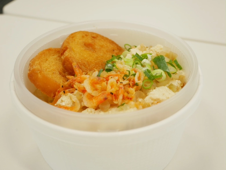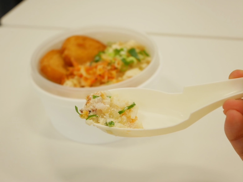 実はこちらの商品、今回いただいた中でいちばんのお気に入り!ガラスープが効いたお粥は、ほんのり香るザーサイのごま油、香ばしい桜エビの味わいとマッチ。揚げパンの代わりのバゲットが豆乳を吸ってこちらもおいしい♡