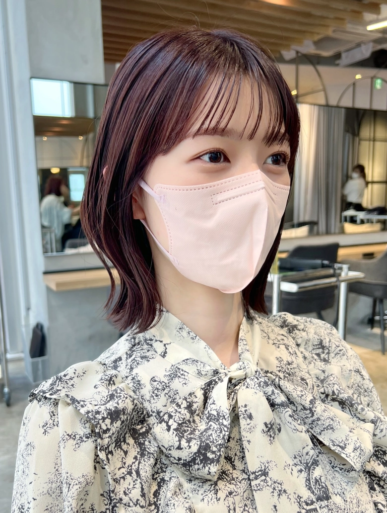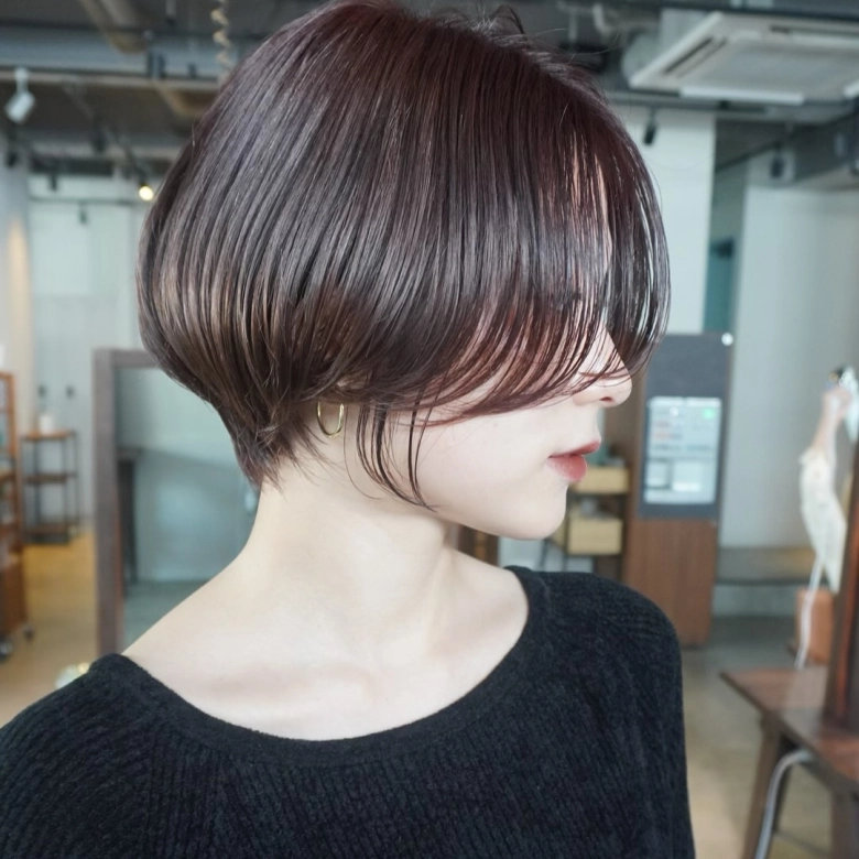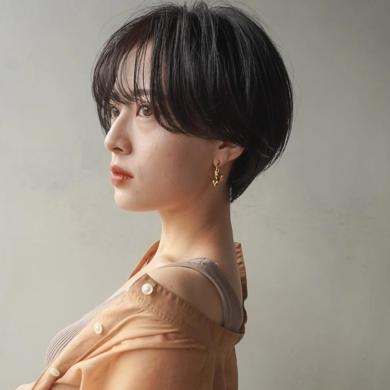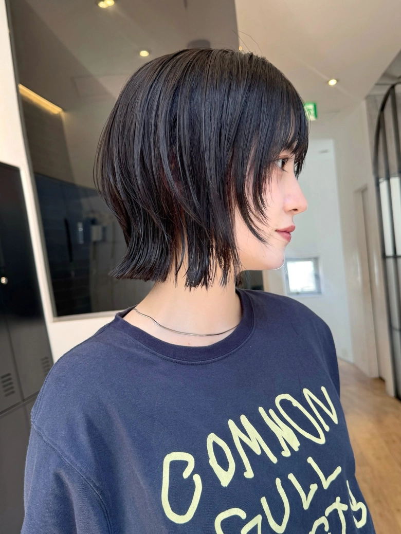 ・前髪ありのショートボブ:顔回りのレイヤーで気になる輪郭から目線を外す