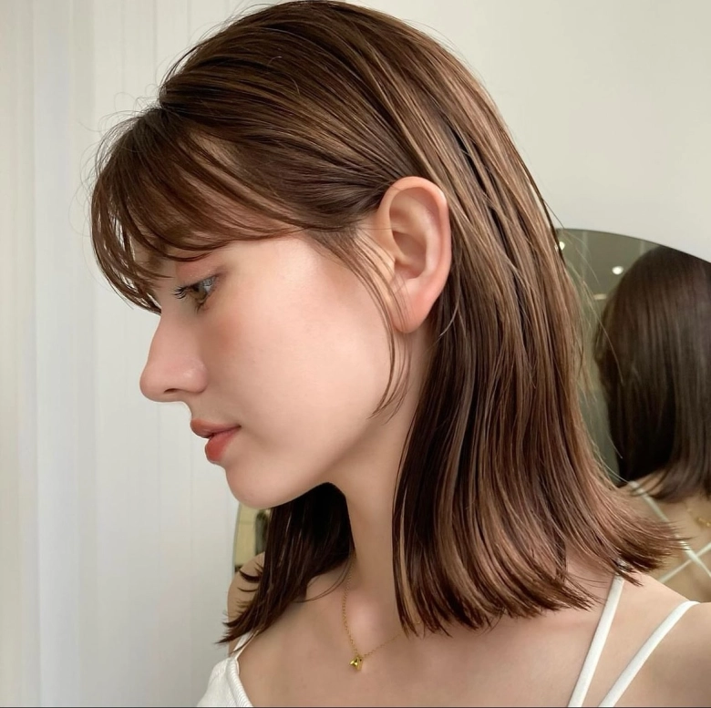 二重あごが気になる方は、全体の毛流れを同じ方向にしないことがポイントです。動きのある毛先には目線を散らす効果があるので、フェイスラインのカバーに効果的です。