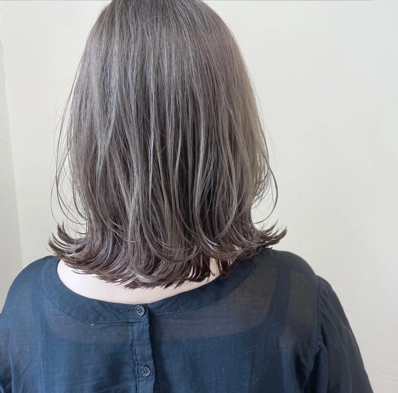 表面全体に軽くレイヤーを入れ、ひし形シルエットを意識したミディアムスタイル。耳から顎下あたりにかけてふんわりと内側にワンカールしており、もたつきやすいフェイスライン付近に動きが出て、顔の輪郭から視線を散らせます。