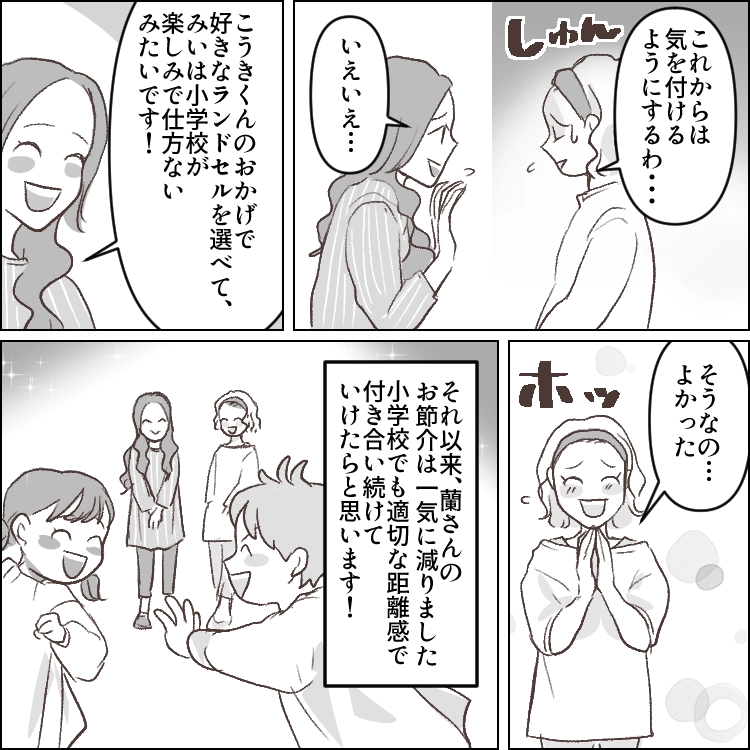 息子・こうきくんにビシッと言われて、自分がお節介をしていたことに気付いた蘭さん。小学校に入学してからも、みんなで仲良く付き合い続けられるといいですね!