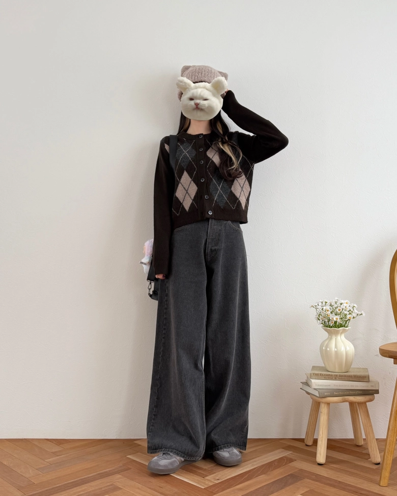 @mero_orem_18さんは、ボトムスとスニーカーのトーンを合わせ、パフニットアーガイルクルーネックカーディガンをコーデの主役に。カジュアルな印象のワイドシルエットのパンツコーデが、アーガイル柄によってフェミニンな雰囲気もプラスされています。
