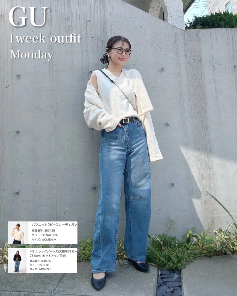 @sato_atsuko_さんのようにセットで着用すれば、おしゃれなレイヤードコーデが簡単に完成♪ナチュラルカラーのパフニット2ピースカーディガンに明るいブルーのデニムをチョイスし、さわやかなコーデに仕上がっています。少しカーディガンを落として肩を見せることで、抜け感をプラスしておしゃれに着こなしていますね。