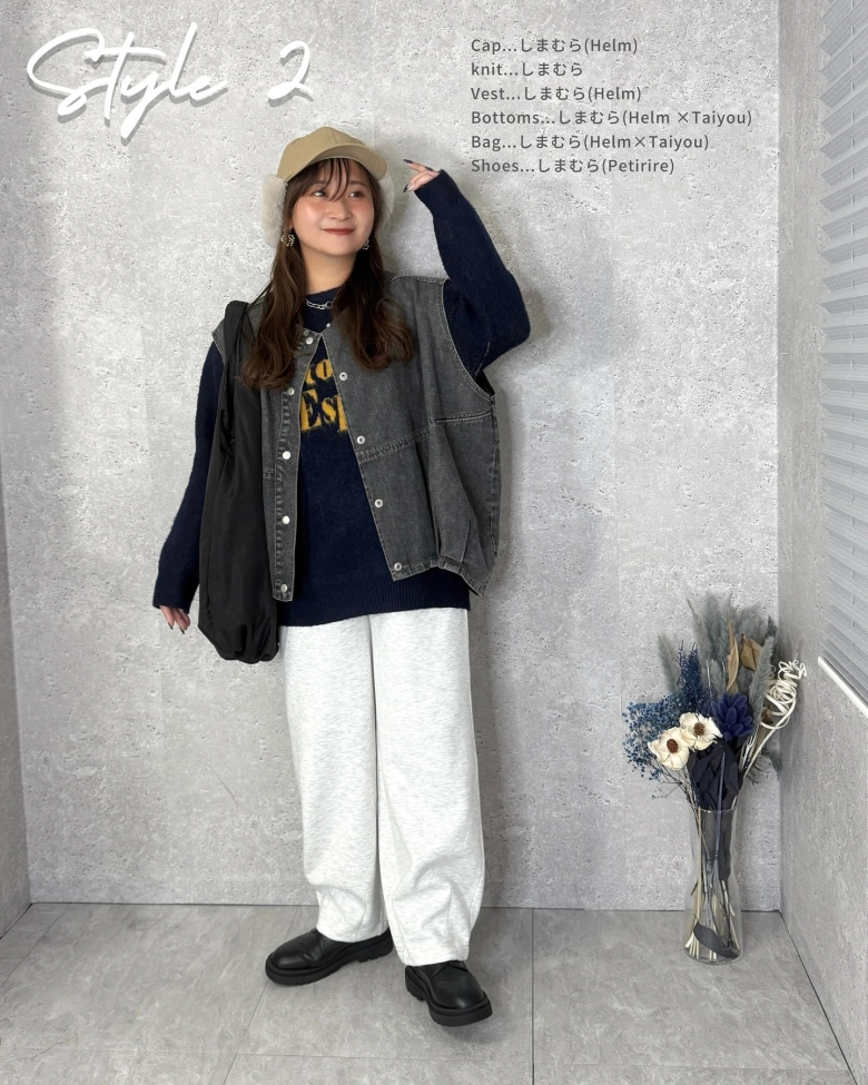 こんな風にゆったりシルエットのニットにベストやスウェットパンツを合わせれば、抜け感たっぷりの休日コーデに。