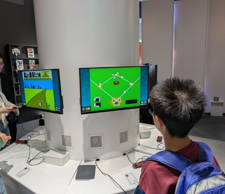 施設が2階建てになっていて、2階のフロアは「知る」空間に。昔のオモチャやファミコンからNintend Switch2までのゲーム機やソフト、ゲームのキャラクターデザインの原画などが展示されています。私たち夫婦は「わー懐かしい!」と声を上げ、息子は「へー昔はこんな感じだったんだ」と楽しそうに見ていました。
