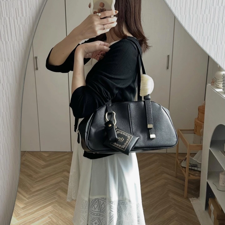 持ち手のデザイン&チャームつきで、シンプルコーデもぐっと華やかに。オンオフ問わず使えるサイズ感で、通勤にも休日のお出かけにもぴったりです。軽量で肩が疲れにくいのもうれしいポイント♪