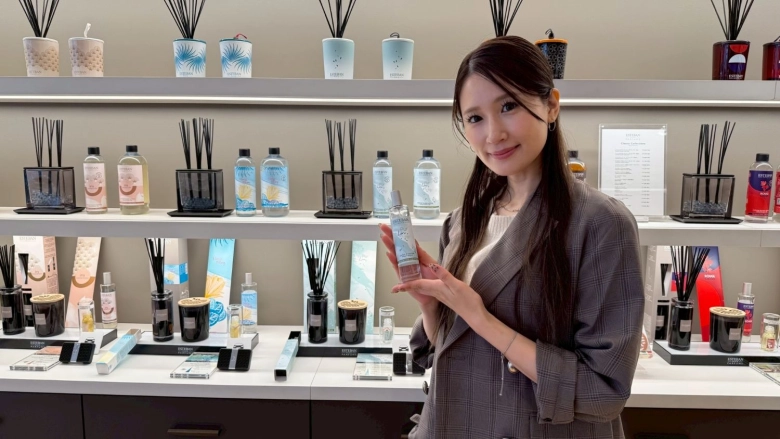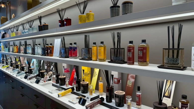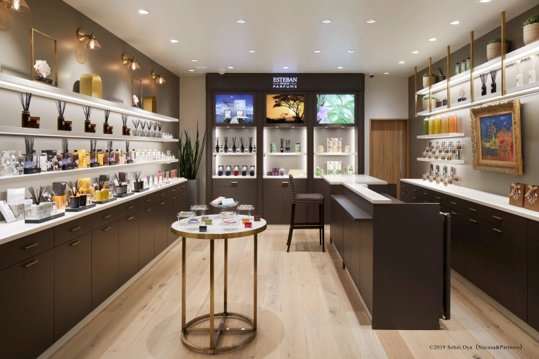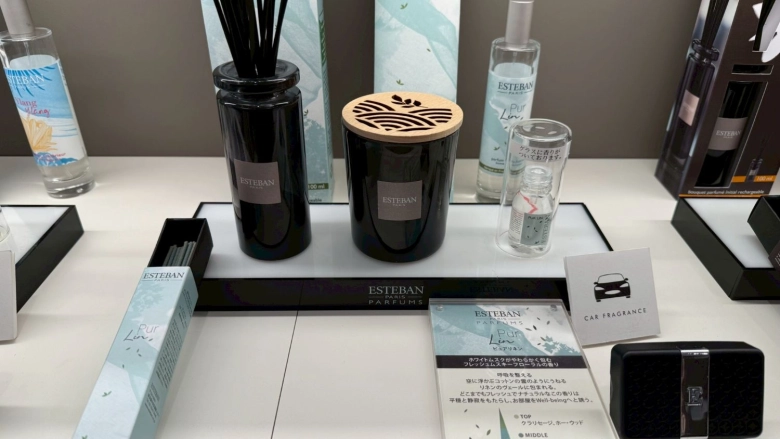 ルームフレグランスやフレグランススプレー、キャンドル、車用フレグランスなど、たくさんの香りアイテムがずらりと並ぶESTEBAN GINZA。