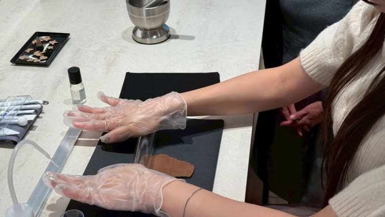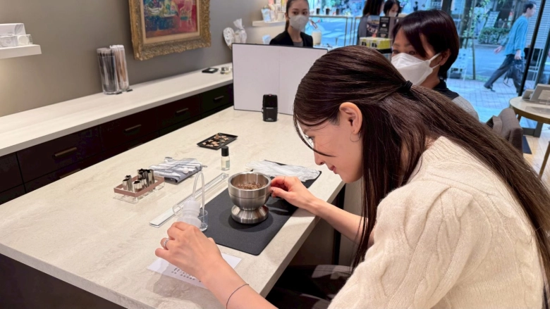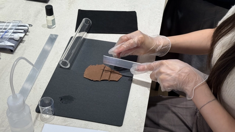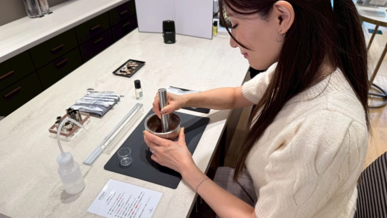まずはボウルに、お香の元となるタブノキの粉末を入れ、先ほど選んだ「ピュアリネン」のオイルを15滴垂らし、しっかりと撹拌(かくはん)させます。「ホワイトムスクの良い香りがして、癒されます〜」と、かえでさん。