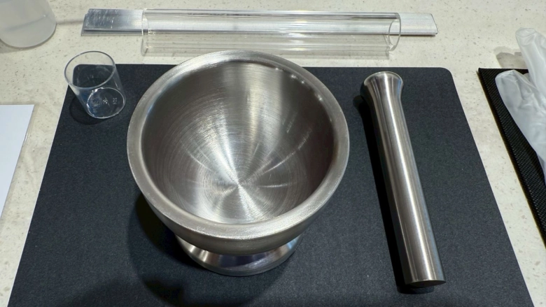 水8mlを追加し、さらにしっかりと混ぜ合わせます。意外と力がいる作業なのですが、かえでさんはサクサク!あっという間に粉末がまとまってきました。