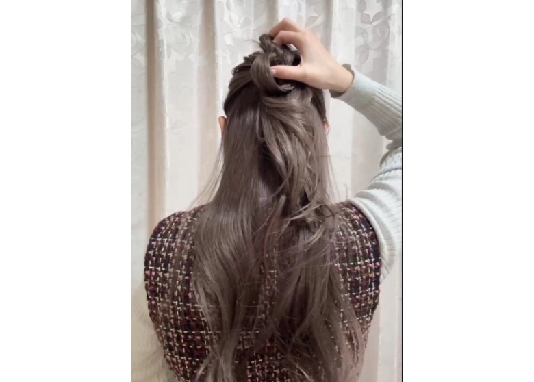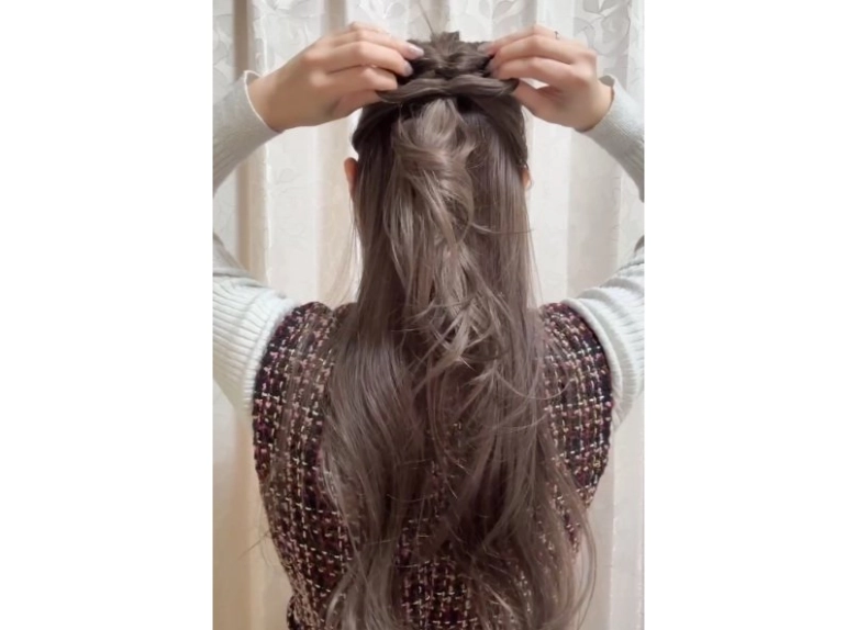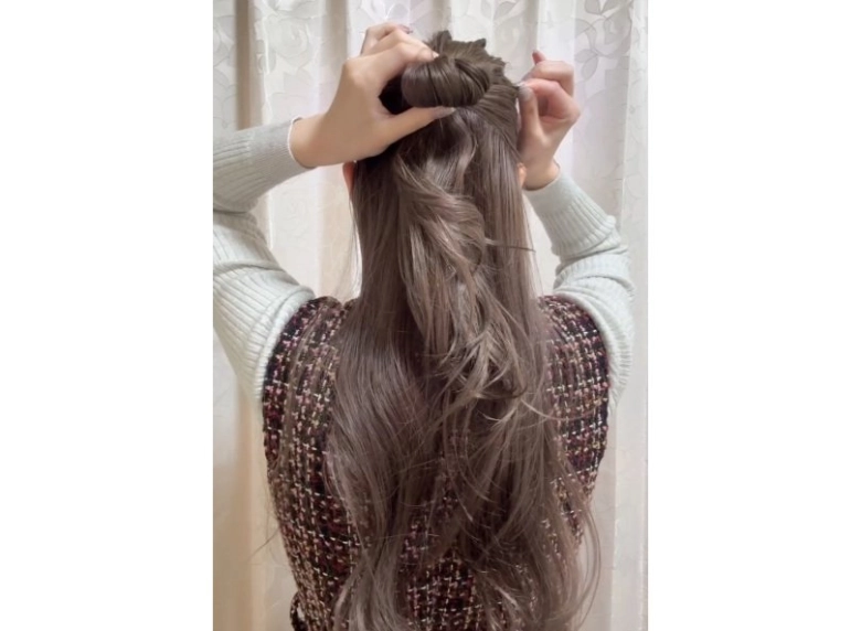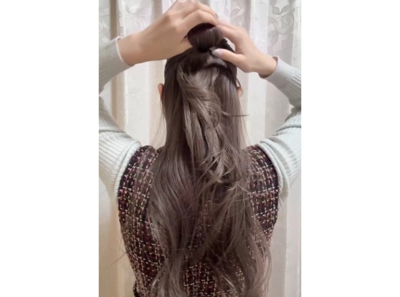 ②でハーフアップに結ぶとき、最後の毛先は抜き切らずにお団子のようにして輪っかを作ります。