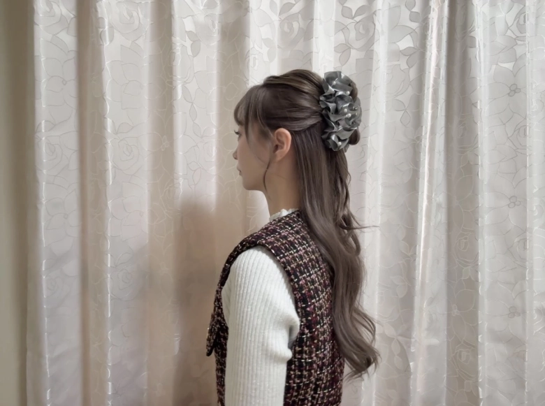 全体を巻き終わったら、耳上の位置でハーフアップします。