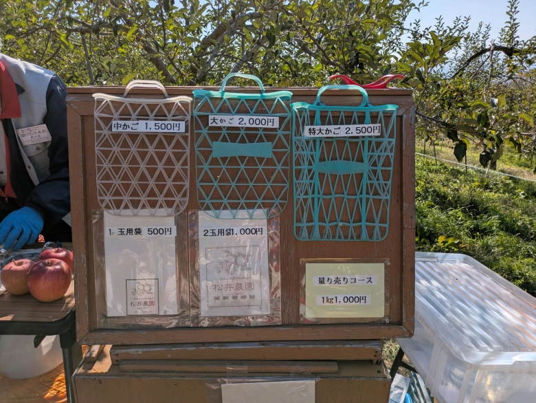 気に入ったリンゴは写真のかごを購入してお土産に持ち帰ることもできますよ。中サイズのかごで3~5玉入るそうです。