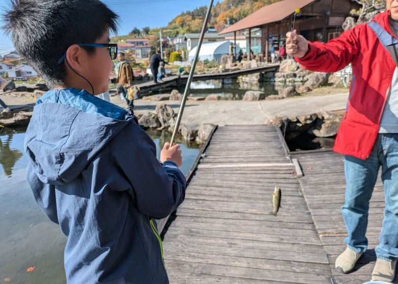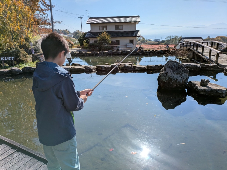 敷地内にニジマス釣りのできる釣り堀があり、初めての釣りにチャレンジ!