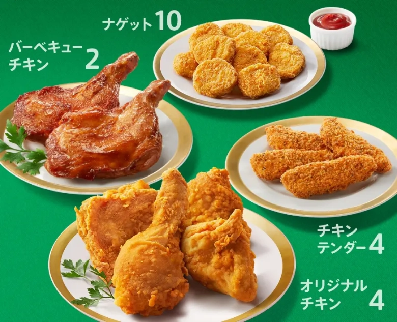 セット内容:オリジナルチキン4ピース、バーベキューチキン2ピース、チキンテンダー4ピース、ナゲット10ピース