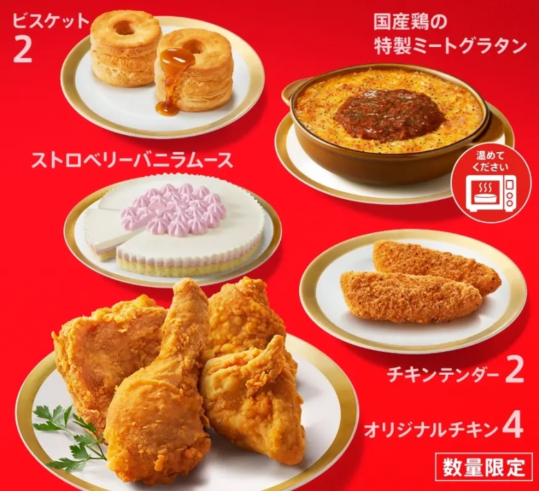 セット内容:オリジナルチキン4ピース、チキンテンダー2ピース、国産鶏の特製ミートグラタン、ストロベリーバニラムース、ビスケット2個