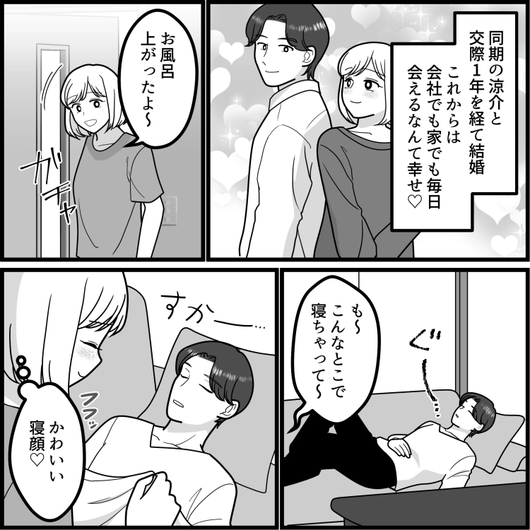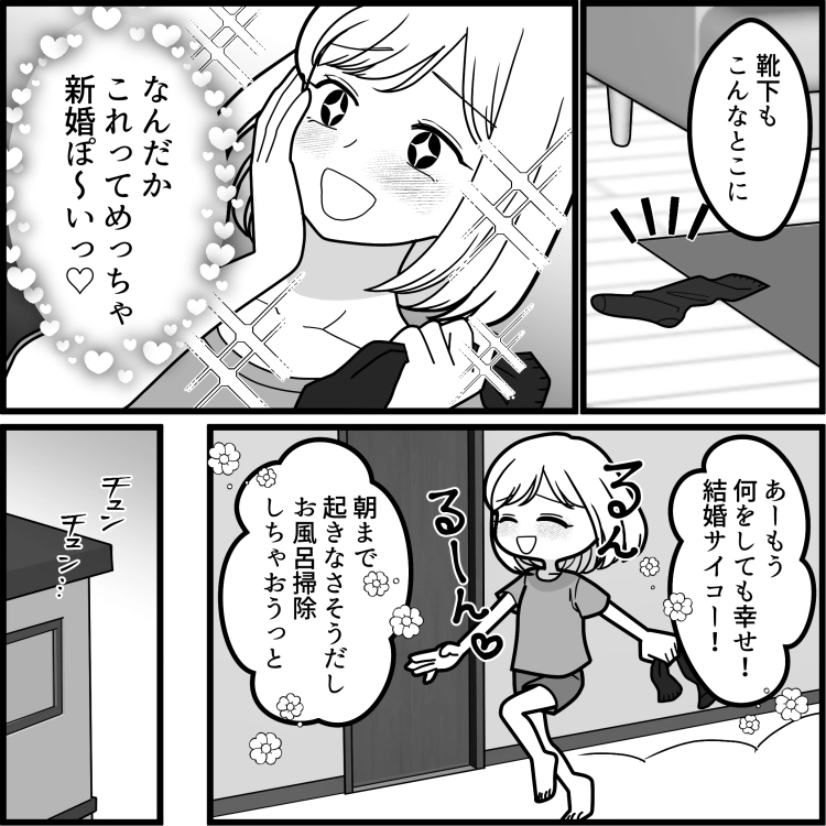 由美は同期の涼介と結婚したばかり。一緒に暮らすようになり、家でも会社でも毎日会えることに幸せを感じる由美。夫がソファで朝まで寝てしまったり、靴下をそのへんに放置していることでさえ、愛しく思っていた。そんなある日、生理痛で体がしんどい由美は、夫にお風呂掃除を頼むことに。しかし、普段やっていないため、掃除を渋る涼介。そんな彼に、時短お掃除アイテムを渡して、簡単に掃除ができることを伝える由美だったが、なんといきなり夫が激怒してしまう事態に!?