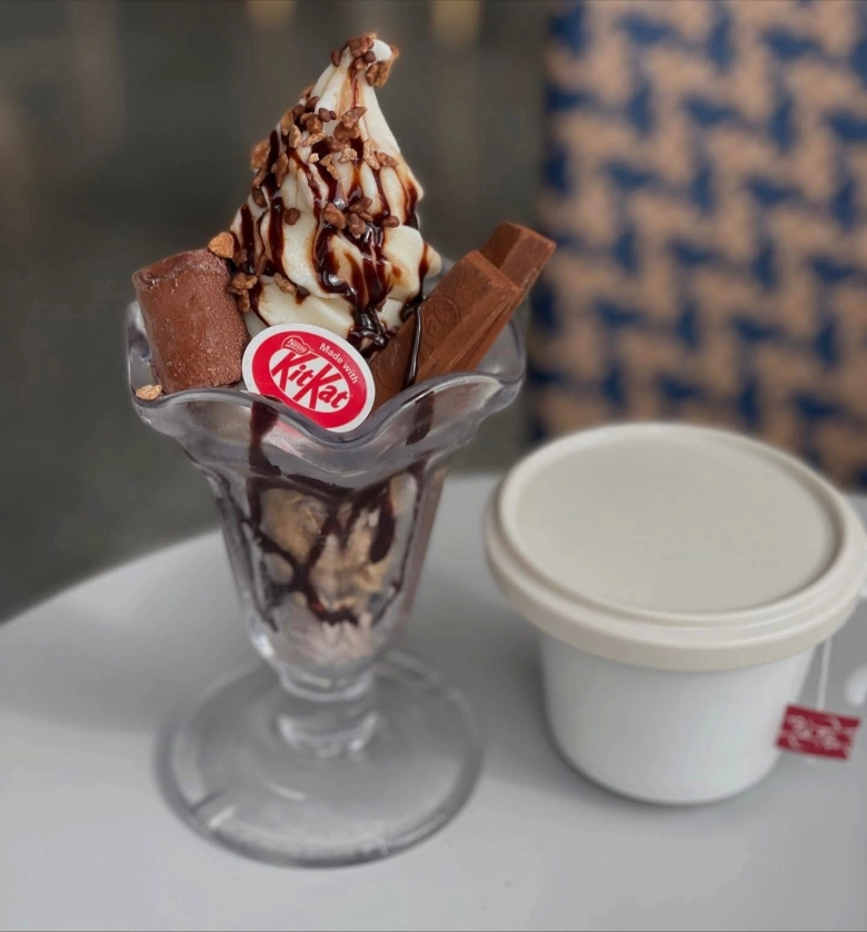 ミニサイズのキットカット2本と、生チョコアイスをトッピング。さらに、ベルギーチョコレートソース、チョコホイップを重ねた“チョコ尽くし”の一品です。濃厚なソフトクリームとチョコレートの相性は抜群で、一口ごとに満足感たっぷり♪チョコ好きさんのスイーツ気分をしっかり満たしてくれるご褒美パフェを、ぜひ味わってみてください。