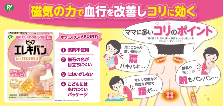 自分のケアが後回しになってしまうママたちに朗報です!”ママのための”【ピップエレキバン】があるのをご存じでしたか?気になるニオイもなく、授乳中、妊娠中にも貼付できます。ママ専用のお助けグッズを活用して、身も心も軽い毎日を過ごしましょう。