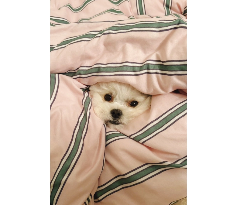 この時期になると人間でもお布団から出られなくなりますよね。もふもふのお布団からのぞくつぶらな瞳が何とも愛くるしい♡