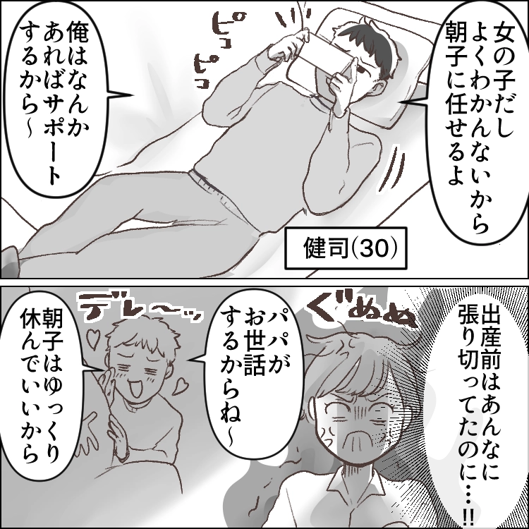 朝子は娘を出産したばかり。人生初の育児に日々奮闘していた。しかし、夫の健司はぐうたらしてばかりで何もしてくれない。出産前は「育児は俺がやるから」と豪語していたものの、実際には娘の世話を頼んでも「女の子のことはよくわからない」と言い訳をしては、逃げていた。そんな夫の態度にイライラし、電話で先輩ママである友達に愚痴をこぼす朝子。すると、便利家電を勧められる。少しでも家事育児の負担を減らすべく夫に便利家電の導入を提案する朝子だったが、なんと彼からは信じられない言葉が返ってくることに!?