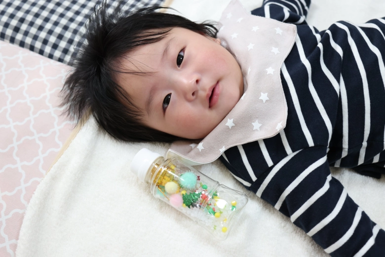 ママの手作りおもちゃににっこりの6カ月ベビーが登場です!