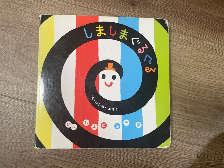また、『しましまぐるぐる』も鮮やかな色味が、子どもたちの興味をひく絵本でした。声を出しながら読むと、しましまやぐるぐるという場面で喜び、最後の穴が開いているところに指を通したりして遊んでいました。『しましまぐるぐる』は、しかけ絵本という分類ではないのかもしれないのですが、布バージョンも出ているので、合わせて使うとより楽しめるかなと思います。