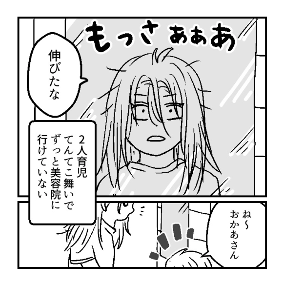 主人公は毎日2人育児で大忙しのママ。自分の見た目についてはついつい後回しにしてしまうため、気づくと髪がボサボサ伸び放題な状態になっていた。