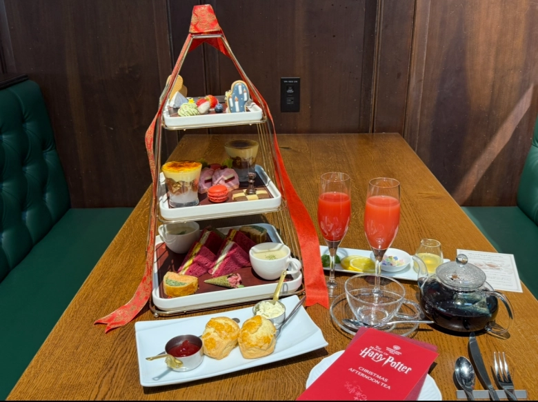 館内で楽しめるフードメニューは、どれも世界観にぴったり!『ホグワーツ・イン・ザ・スノー』期間限定のアフタヌーンティーは、三段のティースタンドにホリデーカラーのスイーツがぎゅっと並んでいます。ベリーを使ったグラスデザートやスコーン、赤いリボンがアクセントのプレートなど、細部まで“ホグワーツのクリスマス”を感じるビジュアルで、思わず写真をたくさん撮ってしまいました!