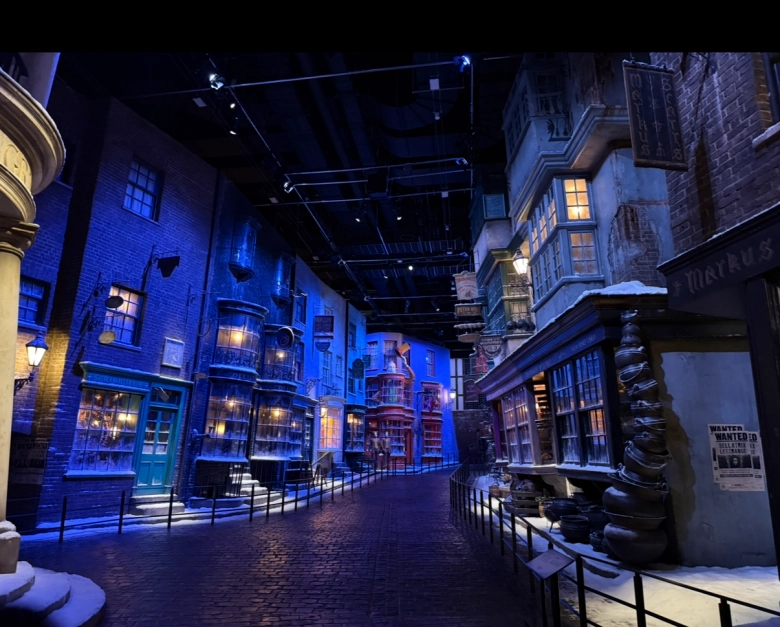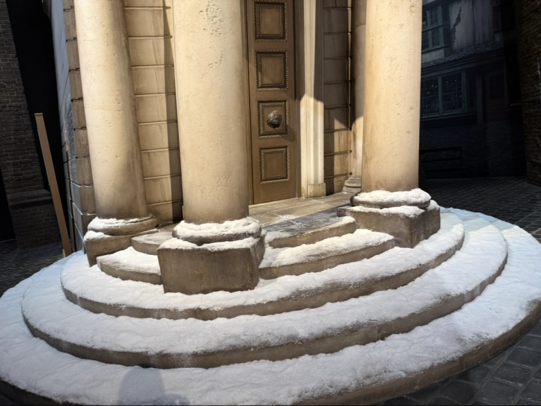 雪に包まれたダイアゴン横丁は、歩くだけでまるで映画の世界に迷い込んだみたいな感覚でした。店先のランプ、積もった雪、つららの質感まで本物そっくりで、「あ、ここ写真撮りたい!」が止まらない場所でした。雪の表現もいろいろあって、ふわっと落ちた雪、少し固まった雪…と種類が違うのもポイント。もし子どもを連れてきたら絶対「寒そう〜!」って言うだろうな〜と思うほど、世界観が丁寧に作り込まれています。