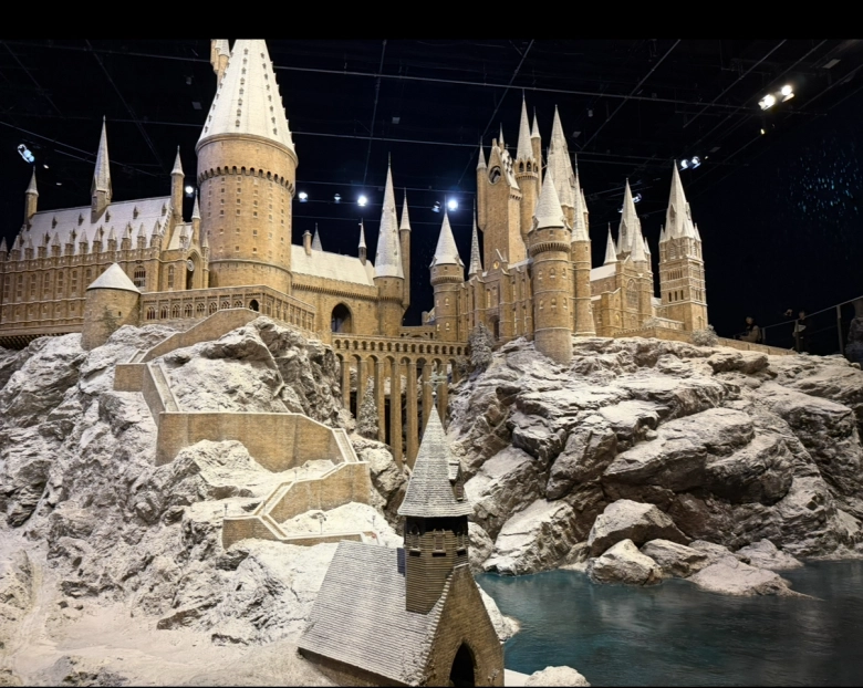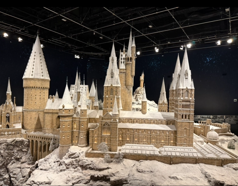ツアー終盤に見学するホグワーツ城の模型の前に立つと、まさに“冬の魔法のクライマックス”。上からお城全体を見下ろすと、雪がふわっと積もった屋根や塔のラインがくっきりと見えて、まるで絵本の1ページみたいでした。