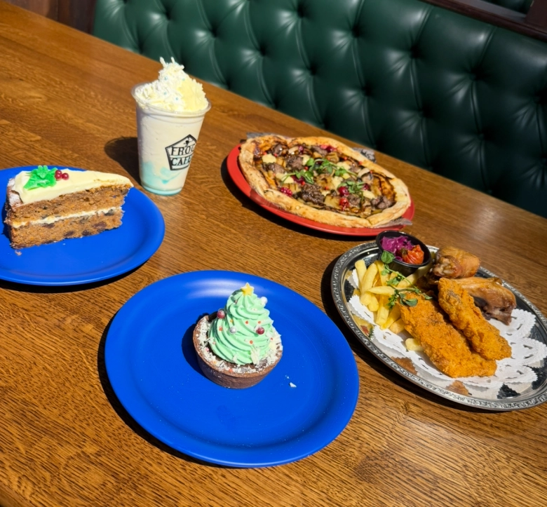 他にも、クリスマスカラーのケーキやツリー型のカップケーキ、具材たっぷりのピザやチキンなど、しっかり食べ応えのあるラインナップでした!どれもハリーポッターの世界観に入り込める色づかいで、食事そのものが“作品の中のワンシーン”のように感じられるのもうれしいですよね。