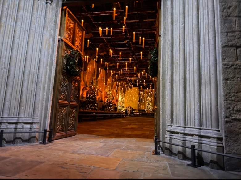 今回の取材でいちばん心をつかまれたのが、大広間のクリスマス装飾。重厚な扉がゆっくりと開いた瞬間、ガラッと空間全体の空気が変わるのを感じました。見上げると、天井には400本以上のキャンドルがふわりと浮かび、温かい光がゆらゆら揺れている。照明とは違う、“魔法の灯り”ならではの柔らかい輝きが広がっていて、一歩踏み込むだけで映画の世界に入り込んだような没入感がありました。左右に並ぶ高さ約6mのクリスマスツリーは、すべてデザインが異なる特別仕様。近くで見ると、ひとつひとつ装飾の配置や色づかいが微妙に違っていて、職人さんの手仕事に思わず見入ってしまいました。